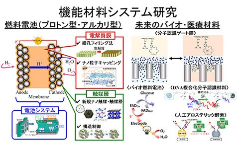 環境問題、エネルギー・資源枯渇問題など地球規模の問題の解決、豊かな生活持続のための医療・医薬技術の進展、リサイクル技術など、どの分野でも新しい機能材料・プロセスの開発が必要不可欠です。これらの分野では、単純でなく精緻で複雑な機能を示す材料デバイス及びプロセスが要求されています。こ れら高機能な化学システムは、最先端の要素技術とこれらを統合する画期的なアイデアにより生まれます。分子レベルから材料を合成し、デバイス化、プロセス化を俯瞰的に考慮し、社会および地球のために真に必要な科学技術のブレークスルーを目指します。材料自身をシステムとしてとらえ、複数の素材を有機的に結びつけ、新機能を発現する"機能材料システム"および、そのプロセス化までを対象とします。具体的には、燃料電池、バイオマテリアルの創製から、持続発展可能な地球環境保全技術へと展開します。
