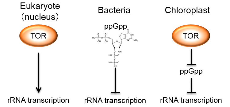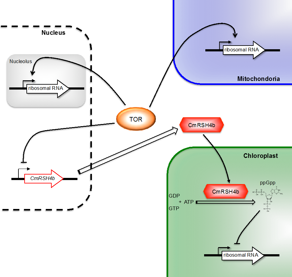 But how does TOR regulate chloroplast rRNA transcription in a cell? We tried to answer this question by analyzing the effects of TOR inhibition. We found that this inhibition increased the expression of a nuclear-encoded chloroplast gene, CmRSH4b, which encodes a homolog of the signal molecule guanosine 3′-diphosphate 5′-diphosphate (ppGpp) synthetases that modulates rRNA synthesis in bacteria. Further genetic and biochemical analyses demonstrated that the synthesis of CmRSH4b-dependent ppGpp in chloroplasts is an important regulator of chloroplast rRNA transcription (Fig. 2)[4].