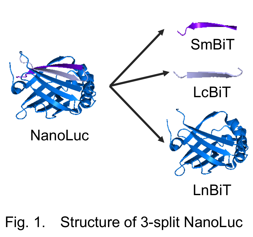 For the assay, we utilized a recently developed small luciferase "NanoLuc" originated from a deep sea shrimp. The luminescence of NanoLuc is very bright, and while its structure is very stable. NanoLuc is consisted of 11 β-strands. In a frequently used intracellular protein-protein interaction assay Protein-fragment Complementation Assay (PCA), a sensor enzyme or a fluorescent protein is divided into two fragments. In conventional PCA using NanoLuc, NanoLuc was divided into the C-terminal β-strand named "SmBiT" and the remaining part "LgBiT" 2). This time, we divided it into three, namely, one strand named "LcBiT (the C-terminal strand of LgBiT)", another strand "SmBiT", and the remaining part named "LnBiT (the N-terminal part of LgBiT)" (Fig. 1). Both LcBiT and SmBiT have fairly small sizes (11 aa ~1.2 kD).
