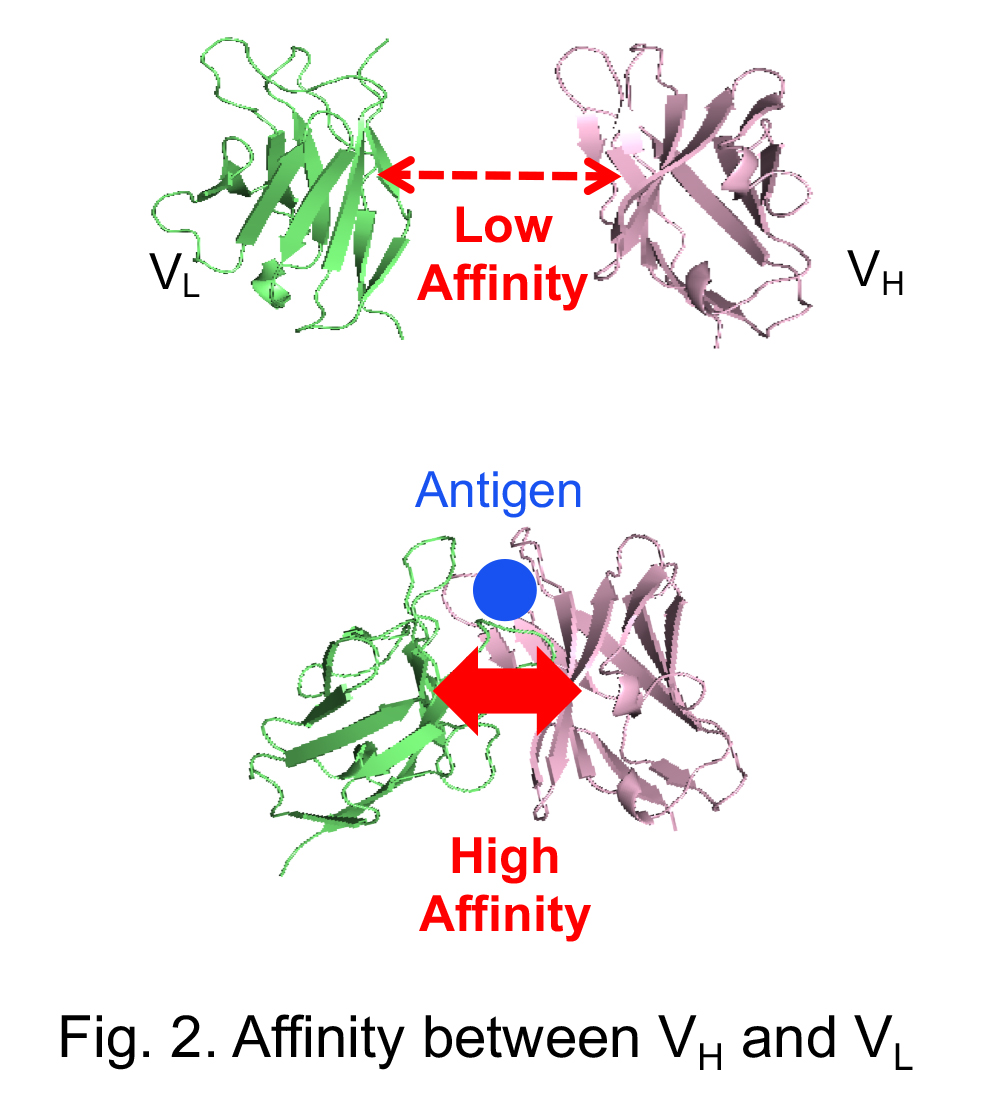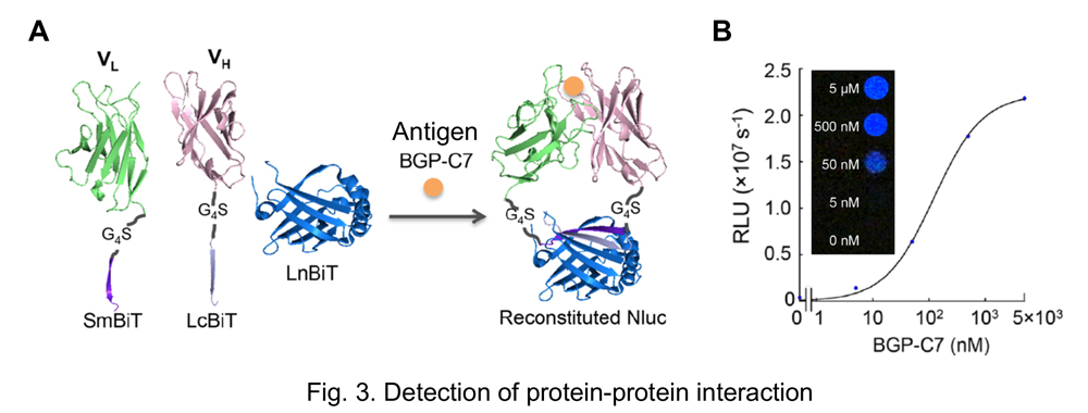 In this study, a pair of two antibody fragments, VH and VL that consist an antigen binding sites, was applied as an interacting pair. The affinity between VH and VL isolated from an antibody, especially when its antigen is a small molecule, is usually low in the absence of antigen. However, the affinity increases when antigen is added (Fig. 2). The antigen-dependent interaction between VH and VL could not be detected using the conventional NanoLuc PCA, probably due to the problem of folding and/or steric hindrance. Hence, we tried to assay the affinity by our new system using the two small peptides.