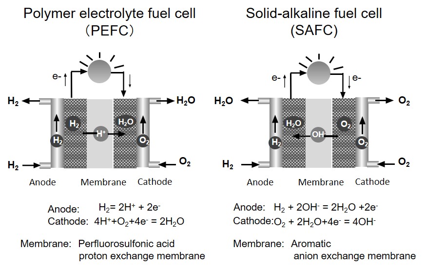 Fig 1.Structure of polymer electrolyte fuel cell (PEFC) and solid-alkaline fuel cell (SAFC)