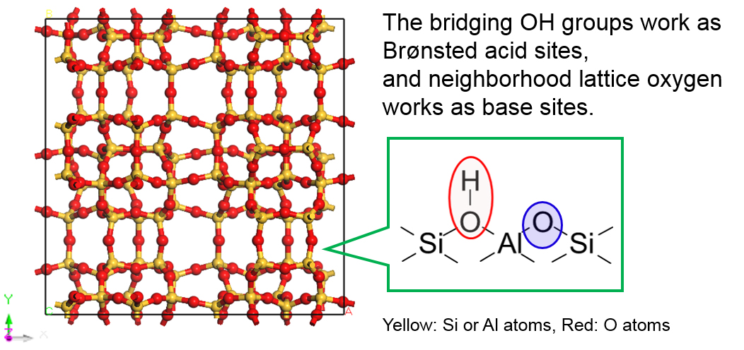 Catalytic reactions over solid acid catalysts are caused by proton-donation from the surface acidic OH groups as active sites, and this mechanism is similar to the case of homogeneous acid-catalyzed reactions. On the other hand, the contribution of lattice oxygen atoms to acid-catalyzed reactions in a concerted manner has been suggested. In the case of ethanol dehydration over proton-form zeolites, ethoxy groups on zeolites were first formed by dehydration of adsorbed ethanol molecules and acidic OH groups. Then, ethene is formed by the decomposition of ethoxy groups regenerating acidic OH groups (Fig. 1), where hydrogen atoms in methyl groups of ethoxy species are selectively abstracted1).