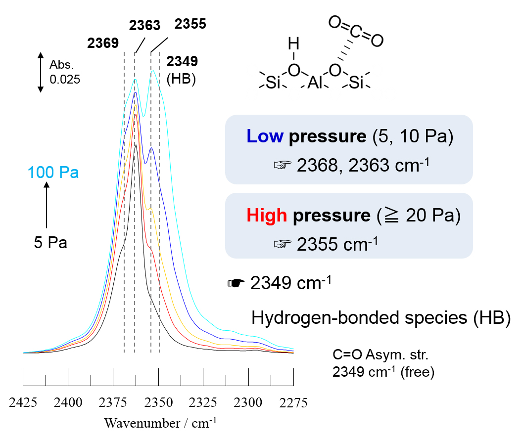 In the conventional method using infrared (IR) spectroscopy, pyrrole and chloroform have been used as probe molecules to characterize the basicity of zeolites2). Some disadvantages are claimed for these methods; the multi-point adsorption structure and large molecule size of probes. In our laboratory, we attempted various probe molecules in order to verify the presence of base sites on proton-form zeolites based on the above problems. As a result, the basicity in lattice oxygens pairing with acidic OH groups was probed by CO2 adsorption3). The experiment could be performed by using in-situ IR cell connected to a conventional closed gas-circulation system at room temperature. Fig. 3 shows difference IR spectra of adsorbed CO2 species on ZSM-5 zeolite, where the presence at least three types of basic lattice oxygen with difference property were confirmed. In addition, the experiment of CO2 adsorption on zeolites with different topology revealed that the types of basic lattice oxygen were affected by the zeolite topology.