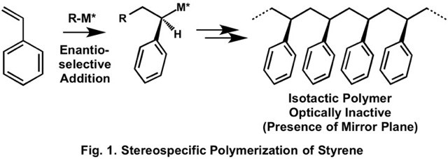 Optically active polymers are abundant in the natural world, and their chemical synthesis through polymerization of prochiral monomers has been extensively studied. Stereospecific addition polymerization of prochiral styrene generally produces optically inactive polystyrene because of the presence of mirror plane in the produced stereoregular polystyrene (Fig. 1).1)