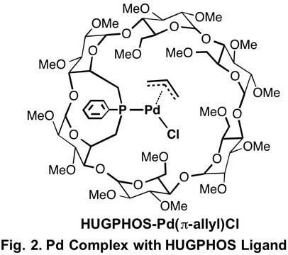 We found that Pd complex with HUGPHOS ligand, which has optically active cyclodextrin structure, promotes polymerization of styrene under CO atmosphere.4) Stereoregularity of the produced polystyrene is not so high but the polystyrene shows optical activity. The pressure of CO is critical in the formation of the optically active polystyrene. Although optically active polystyrene is formed under 1 atm of CO, the polystyrene obtained under higher CO pressure is not optically active. The polymerization under N2 atmosphere affords dimers of styrene due to frequent chain transfer reaction.