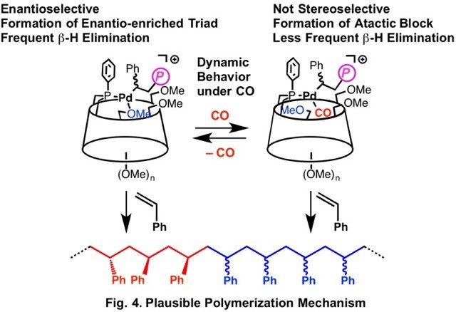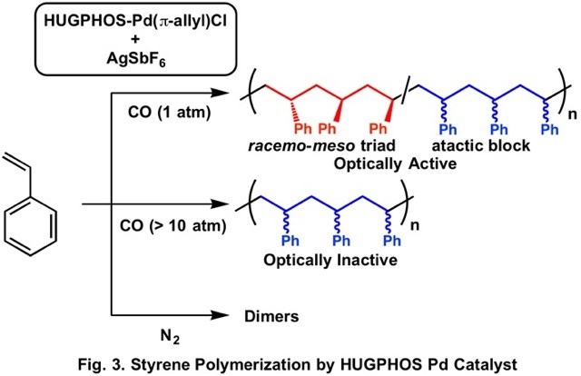 Detailed analysis of the repeating structure of the optically active polystyrene obtained under 1 atm of CO indicates the presence of increased amount of racemo-meso triad structure compared to that of the optically inactive polymer obtained under increased CO pressure. The analysis of the HUGPHOS Pd complex under CO atmosphere showed that CO is weakly coordinated to the Pd center and reversibly undergoes dissociation and coordination to the Pd center during the polymerization. The Pd species with coordinated CO does not cause chain transfer easily, but its stereoselectivity in chain growth is low. On the contrary, the Pd species without coordination of CO can allow enantioselective chain growth, whereas it easily undergoes chain transfer via b-hydrogen elimination. Under appropriate pressure of CO, reversible coordination and dissociation of CO leads to the equilibrated mixture of those two species, which enables formation of the polystyrene containing alternating enantio-enriched racemo-meso triad and atactic block with sufficient molecular weight. Such dynamic behavior of the optically active complex would enable synthesis of optically active polymers from various prochiral monomers.