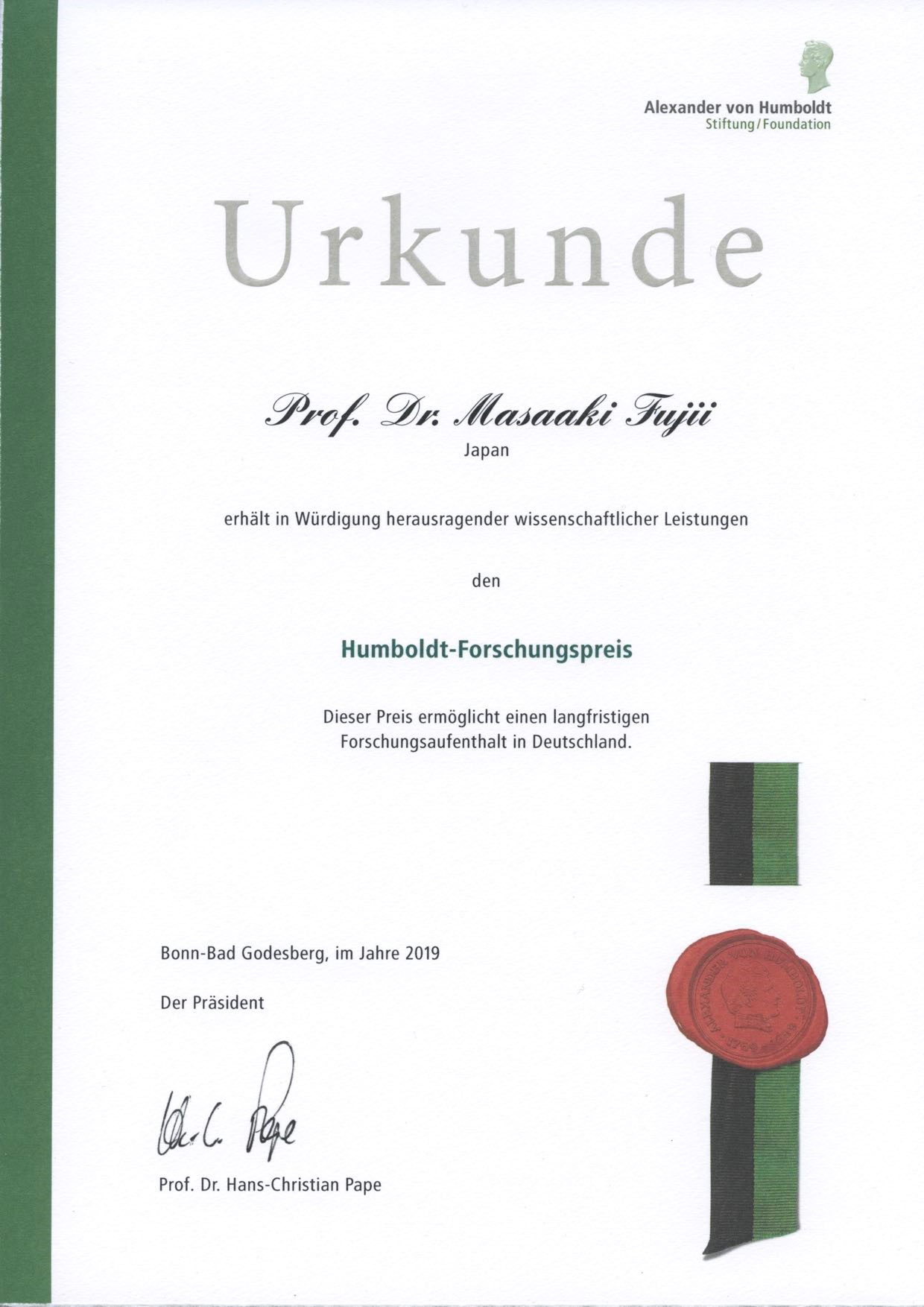 藤井・石内研究室の藤井正明 教授が2019年度フンボルト賞を受賞しました。