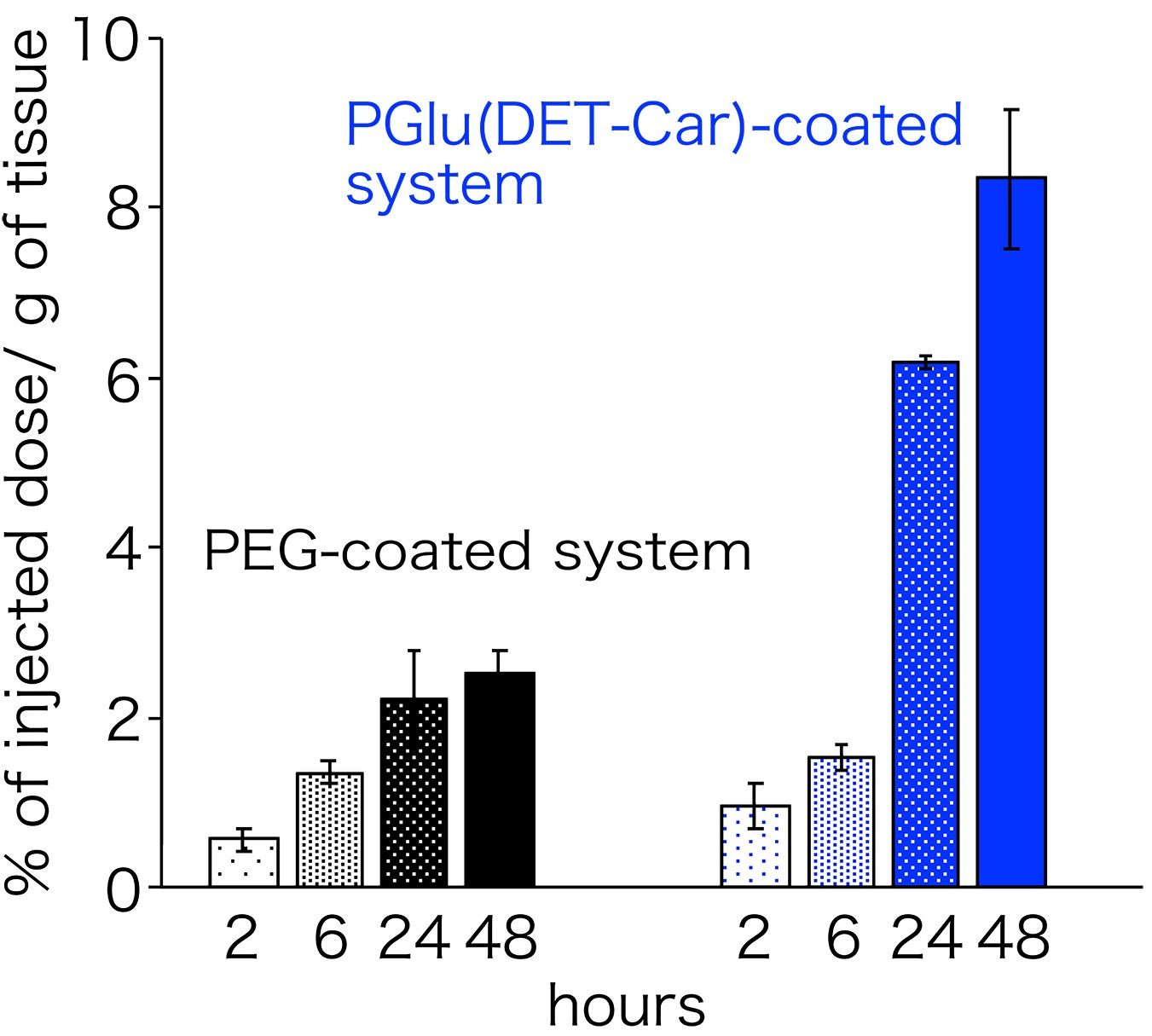 次に、PGlu(DET-Car)をナノ粒子に被覆し、それをマウスの担がんモデルに静脈投与しました。すると、PEGで被覆した系と同等の血中滞留性及び正常臓器への分布を示しました。このことから、血液中および正常組織に対しては、PGlu(DET-Car)はPEGに匹敵するステルス性を発揮することがわかります(図3)。このことは、カチオン性高分子にて被覆した系と比べて高い血中滞留性と肺組織への集積低減(肺は血液中で凝集した粒子が集積しやすい)からも明らかです。特筆すべきことに、がん組織に関しては、PEGの系に比較して約3倍の集積量を示しました(図4)。血液中及び正常組織に対しては同等の挙動を示したことを考慮すると、がん組織への集積量増大はPGlu(DET-Car)ががん組織内pHに応答して性質を変化させたことを裏付けます。中性条件においてはステルス性を発揮するが、がん組織内においてはがん細胞や組織内物質と相互作用することでナノ粒子ががん組織内の滞留性が向上したからだと考えられます。