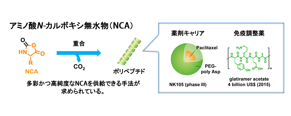 アミノ酸N-カルボキシ無水物(NCA)は生体適合性材料、生分解性ポリマー、薬剤キャリアや医薬品として有用なポリペプチドの原料として重要です。様々なアミノ酸を原料として高純度のNCAを簡便に合成できる手法の開発が求められています。