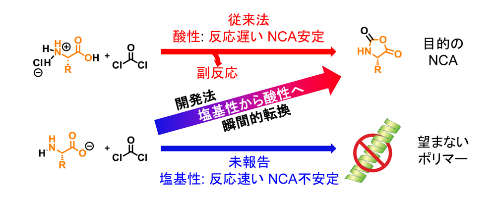 現在唯一の実践的なNCAの合成法1)はアミノ酸に対して酸性条件下でホスゲンおよびホスゲン等価体を反応させる手法ですが、この手法は強酸性条件下で長時間の加熱を要するため、副反応をひきおこす点が問題となっており(図2 上段)、当然のことながら酸性条件下で不安定な官能基をもつNCAの合成は困難です。一方、塩基性条件下でNCAを合成すれば速やかに反応が進行すると考えられますが、目的物のNCAが塩基性条件下で容易に重合してしまうため、未報告となっています(図2 下段)。このような背景から約100年も前に報告された合成手法1) が現在も使用され続けています。