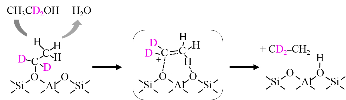 固体プロトン酸触媒反応は、表面に存在している酸性水酸基が活性点となり、不均一に解離した結果生じるプロトン(H+)が付加することで進行すると考えられています。この機構は均一系プロトン酸触媒のものと同様ですが、幾つかの反応で、固体上では酸・塩基のペアサイトが協奏的に反応を進行させていることを示す結果が得られています。例えば、ゼオライト上でのエタノールの脱水反応では、表面水酸基と吸着エタノールから脱水を伴ってエトキシ基が生成し、エトキシ基が脱水素することで最終的にはエチレンが生成します(図1)。そして、後段の反応の際にエトキシ基のメチル基からのみ水素が引き抜かれていることが証明されています1)。