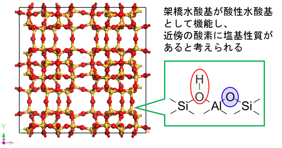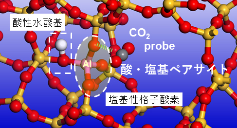 この過程は、図2のような酸点とAlを介してその近傍の格子酸素が酸・塩基ペアサイトとして作用していることを示しています。すなわち前半は酸、後半は塩基の作用で一連の反応が進行していることになります。したがって、固体酸触媒の格子酸素の塩基性評価は、固体酸触媒のキャラクタリゼーションにおいて重要な意味を持つと考えられます。