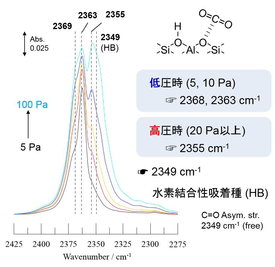 当研究室では、上記の問題点を踏まえて、固体酸触媒上の塩基点の存在を明らかにするため、様々なプローブ分子を試した結果、CO2吸着によって酸性水酸基とペアになっている塩基性格子酸素の存在を証明することができました3)。この実験は、閉鎖循環系へと接続されたin-situ測定用のIRセルを用いて行っています。吸着温度は室温程度であるため、比較的容易に測定が行えるといったメリットがあります。図3は代表的なゼオライトの1つであるZSM-5にCO2を吸着させた際のIRスペクトルです。測定したスペクトルから、ZSM-5上には少なくとも3種類以上の性質の異なる塩基性格子酸素が存在していることを証明できました。また、異なる骨格構造を持つゼオライトへCO2吸着実験を行うことで、塩基性格子酸素の種類はゼオライトの骨格構造によって異なることも明らかとなりました。