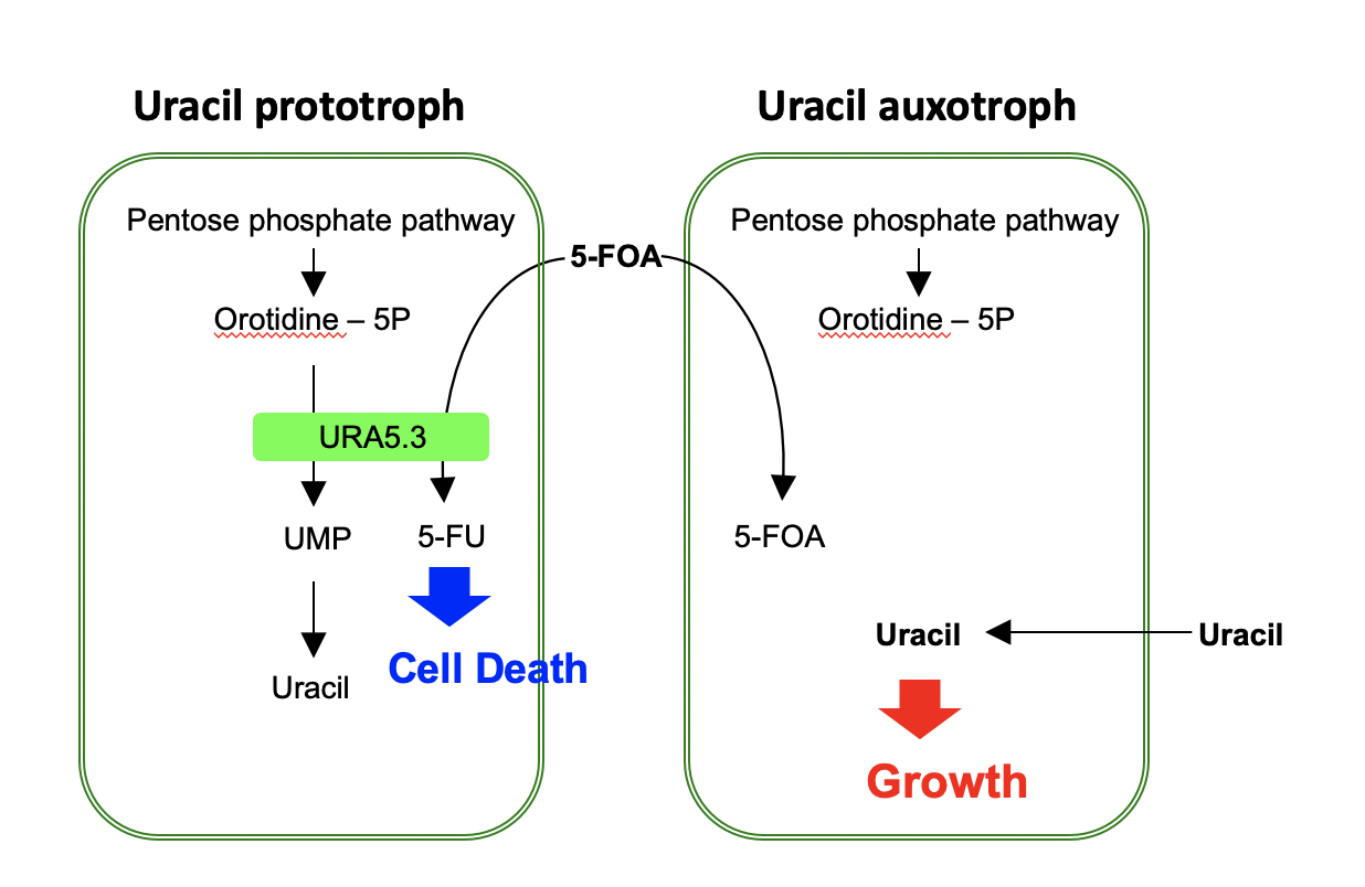 選択マーカー遺伝子を繰り返し利用するためには、一度導入した選択マーカー遺伝子をゲノム上から取り除く必要があります。そこで、私たちは、URA5.3遺伝子がウラシル合成に必要な基質となるウリジン5'-リン酸(UMP)の生合成に働くと同時に、ウラシル生合成系の前駆体、オロチジン5'-リン酸のアナログである5-フルオロオロト酸(5-FOA)を細胞毒性のある5-フルオロウリジン(5-FU)に変換することに着目しました(Fig. 1)。この性質により、5-FOAの存在下ではURA5.3遺伝子を持たない株を選抜することが可能となります。