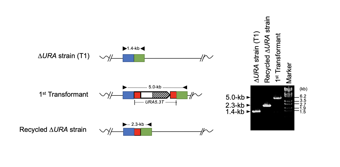 本研究では、一旦導入したURA5.3遺伝子を相同組換えにより欠失させるため、マーカー遺伝子の5'側と3'側に約500 bpのリピート配列を配置した改変URA5.3遺伝子(URA5.3-T)を作製しました[4](Fig. 2)。5-FOA存在下では、URA5.3遺伝子が細胞毒性のある5-FUを産生してしまうため、URA5.3遺伝子を失った細胞を選択することができます。