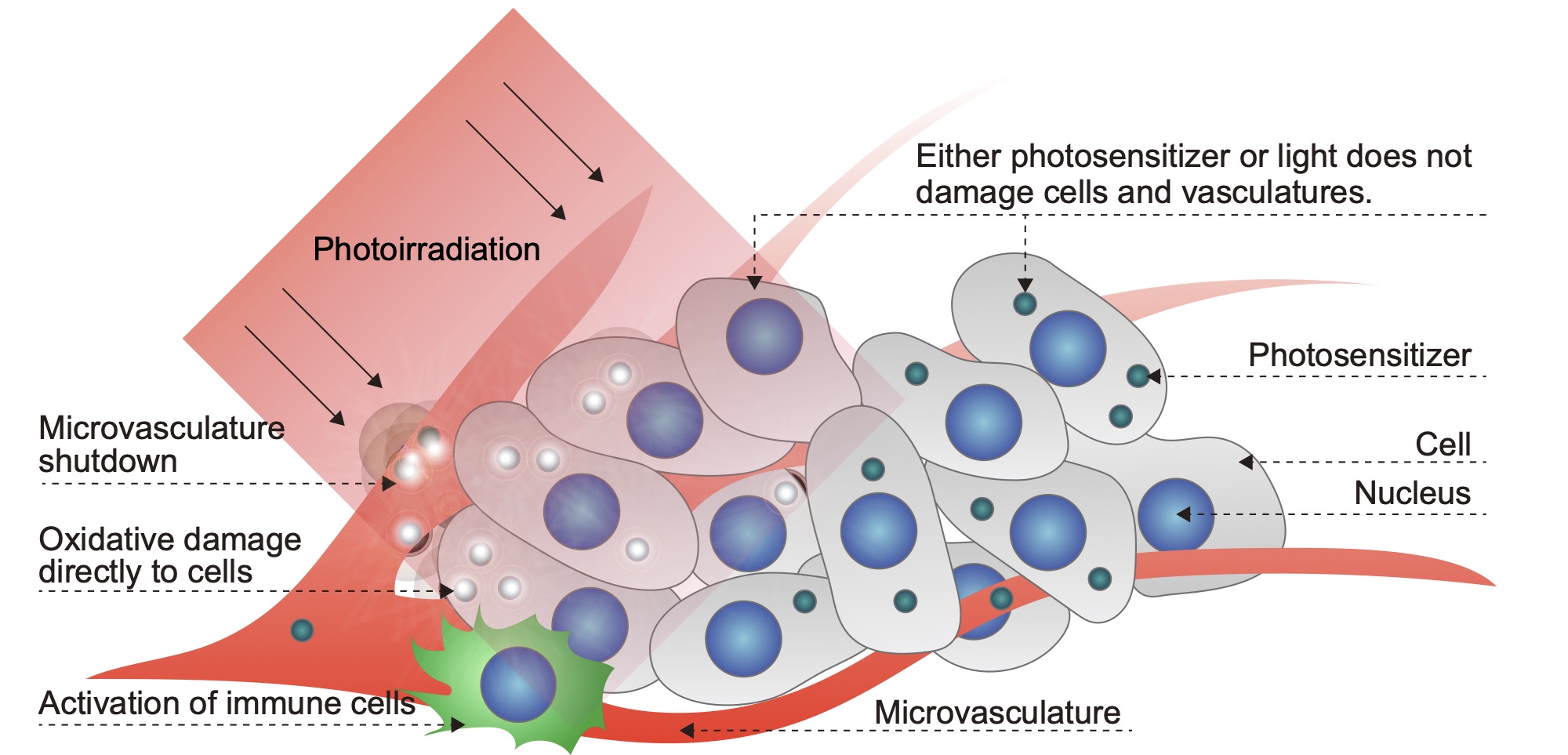 近年、低侵襲的にがんを治療する方法として光線力学療法(PDT)が注目されています。PDTは、光増感剤(光に応答して細胞傷害性の高い活性酸素を産生する薬物)をがんに集積させた後、がんの存在する部位に光を照射することにより、がんを選択的に殺傷します(図1)(1)。より詳細なメカニズムとしては、がん細胞に対する活性酸素によるダメージという直接的な効果の他に、がん関連血管に傷害を与えて血流を阻害しがんに栄養が届かないようにして殺傷する間接的な効果があります。さらに、PDTを行うと免疫細胞が活性化されることが報告されており、近年注目されている免疫療法との併用療法が期待されています。現在、フォトフリンやレザフィリン等の光増感剤が既に臨床で使用されており、早期肺がん等に対して極めて優れた治療実績が得られています。一方で、これらの光増感剤が選択的に集積できないがんもあり、PDTの適用範囲を広げていくためには、光増感剤を効率的にがん組織に送り届けるための新しい技術が必要です。そのような光増感剤をがんに送り届ける技術として、我々は精密設計高分子を基盤とした薬物送達システムの開発に取り組んできました。ここでは、下記2つの我々の開発した高分子コンジュゲート型薬物送達システムについて紹介します。