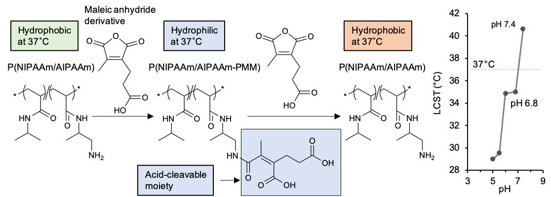 図2. pHの微量低下に応答して親水性から疎水性に物性を変化させる機能性高分子 (P[NIPAAm/AIPAAm-PMM]) (2).