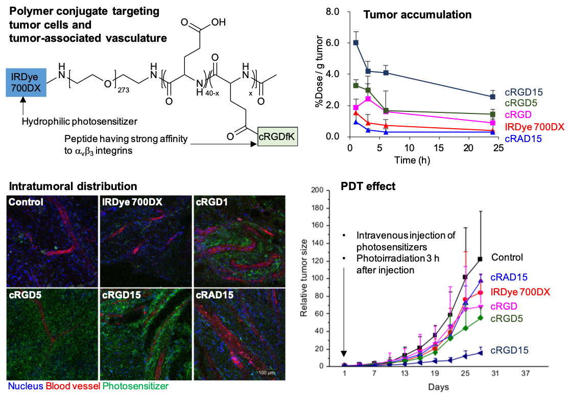 腫瘍選択性をさらに高めるには、積極的に腫瘍と相互作用する分子を設計することが重要です。また、PDTの原理を有効活用するには、腫瘍細胞だけでなく腫瘍関連血管も同時に標的とすることが有用であると我々は考えました。そこで我々は、腫瘍関連血管と多くの腫瘍細胞で過剰発現が報告されているαvβ3インテグリンを標的とした高分子コンジュゲートを開発しました(図4)(3)。具体的にこの高分子コンジュゲートは、poly(ethylene glycol)-poly(L-glutamic acid)という生体適合性高分子の側鎖に、αvβ3インテグリンに対して強いアフィニティを持つ環状RGDペプチドが複数導入され、末端に親水性の光増感剤IRDye 700DXが結合した構造を持ちます。本高分子コンジュゲートはαvβ3インテグリン過剰発現細胞に選択的に効率よく取り込まれました。また、マウス皮下腫瘍モデルに対して静脈注射を行うと、正常組織にはほとんど集積せず、極めて腫瘍選択的に集積しました。そして、高分子に結合する環状RGDペプチドの数を増やすほど、腫瘍に長期的に滞留し、腫瘍血管に対して集積しやすくなるという性質が見られ、さらにはPDT効果が飛躍的に上昇しました。この研究から、腫瘍細胞と腫瘍関連血管の両方を標的とすることはPDTにおいて有用であることが示唆されました。