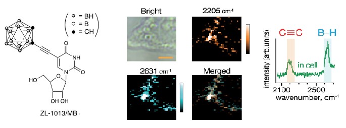 我々は、B-H伸縮振動が2570 cm-1に観測できることに着目し1、B-H結合を有する様々なホウ素クラスター分子のB-H伸縮振動を観測した。その結果、カルボラン誘導体やドデカボレート誘導体がラマン-サイレント領域に特徴的なラマンバンドを有することが分かった。C≡C結合もラマン-サイレント領域に特徴的なシグナルを持つ結合であることが知られており、細胞内ラマンイメージングに用いれている。2-4分子内にC≡C結合を持つカルボラン誘導体ZL-1013/MBの細胞内イメージングを図1に示す。ZL-1013/MBの細胞内イメージングではC≡C結合とB-H結合に由来する両シグナルを検出することに成功した5。