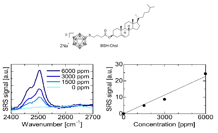 SRSイメージングで測定するホウ素薬剤分子として図2に示す。disodium BSH-cholesterol (BSH-Chol)を合成した。BSH-CholはB-H伸縮振動に由来する2505 cm−1のラマンバンドを有するこた、シグナルは薬剤分子の濃度依存的に向上することから、イメージングによる薬剤分子の定量も可能であることが分かった(図2)。