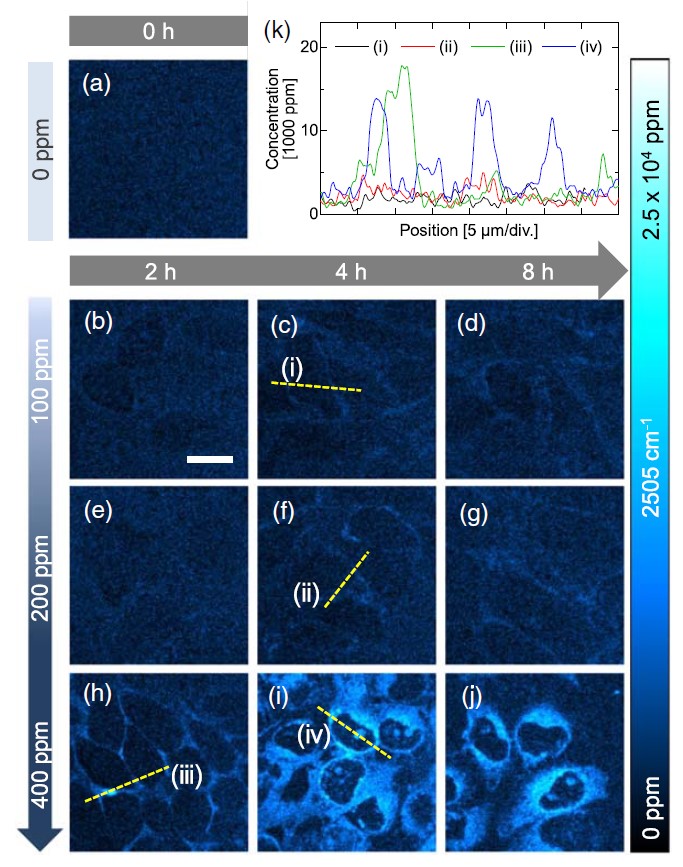 SRSイメージングによってHeLa細胞に集積したBHS-Cholを観測したところ、濃度依存的、処理時間依存的な細胞内へのBSH-Cholの集積が観測できた。特に細胞質や核小体と思われる領域への集積が確認された。また、400 ppmBの投与時に15,000 ppmBの集積が確認され、部位によっては35倍以上の濃度で濃縮され、局在していることが分かった。これらの結果はBSH-Cholの空間分布を定量的に分析できた結果であることが示唆される8。
