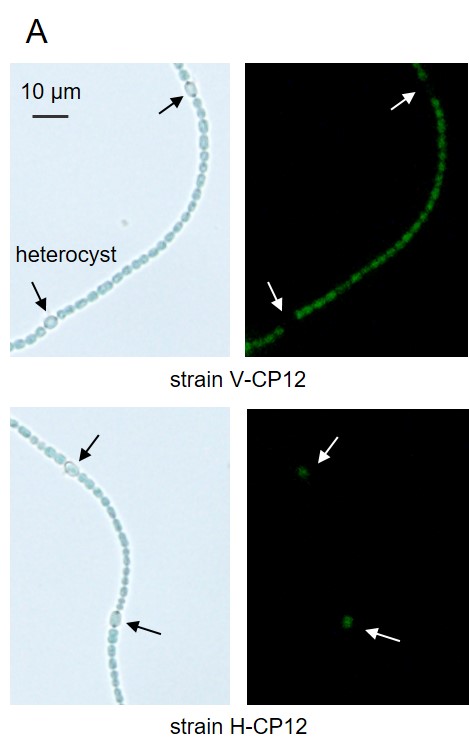 葉緑体の起源と言われるシアノバクテリアは、光合成研究において極めて重要な微生物である。Anabaena sp. PCC 7120(Anabaena 7120)は、細胞が数珠状に連なった糸状性のシアノバクテリアで、窒素源が欠乏すると数珠上に連なった栄養細胞が、10~20個に1個の割合でヘテロシストという特殊な細胞へ分化するという特徴を持っている。ヘテロシストでは、細胞内に取り込んだ大気窒素を、光合成で得られたエネルギーや酸化的ペントースリン酸経路で獲得した還元力を利用してアンモニアに還元する。このアンモニアを用いて生成されたアミノ酸は、隣接する栄養細胞へ供給される。Anabaena 7120ではレドックス制御システムが、光条件だけではなく窒素条件の変化にも応答していることを、私たちは既に明らかにしている1)。