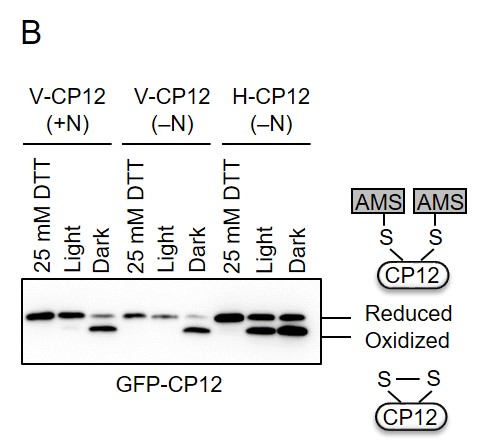 これまでの研究で、窒素欠乏条件下では栄養細胞とヘテロシストでTrxの標的のレドックス状態が異なる可能性が示された。そこで、Trxの標的として知られているCP12に緑色蛍光タンパク質(GFP)を融合し、栄養細胞とヘテロシストにそれぞれ特異的に発現させた。CP12は、細胞内のTrxの標的のレドックス状態を可視化するセンサーとして利用されている2)。この融合タンパク質を栄養細胞に発現させた株をV-CP12株、ヘテロシストに発現させた株をH-CP12株とした(図1A)。続いて、これらの株からレドックス状態を固定したままタンパク質を抽出後、GFP抗体を用いたイムノブロッティングを行ない、それぞれの細胞におけるCP12のレドックス状態を調べた。タンパク質のレドックス状態は、チオール基修飾剤AMSを用いて決定した。V-CP12株では窒素源の有無に関わらず、暗条件下でCP12が酸化され、光照射により還元された3)(図1B)。一方、窒素欠乏条件下のH-CP12株では、光照射下と暗条件下でCP12のレドックス状態に大きな違いが見られず、光照射下であっても50%程度が酸化状態になっていた3)(図1B)。これらの結果は、ヘテロシストにおいて、Trxの標的が光による制御を受けていないことを示している。