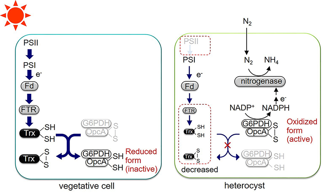 グルコース6-リン酸デヒドロゲナーゼ(G6PDH)は、酸化的ペントースリン酸経路ではたらく酵素であり、ヘテロシストでは窒素固定に必要な還元力を供給するのに重要な役割を担っている。私たちは、以前、シアノバクテリアでは光照射下でTrxがG6PDHの活性化因子であるOpcAを還元することにより、G6PDHの活性を間接的に抑制することを明らかにした1)。また、Anabaena 7120では、窒素条件によって細胞内のOpcAのレドックス状態が変化し、窒素欠乏条件下では光照射下であっても大部分のOpcAが酸化されG6PDHが活性を維持していることも明らかにした1)。これらの結果から、窒素固定を行なうヘテロシストでは、光照射下でもOpcAが酸化型で存在しているものと予想された。なぜ光照射下であっても、ヘテロシスト内ではOpcAが酸化されているのだろうか。この疑問をきっかけに、本研究では、ヘテロシスト内のレドックス制御システムを解明することを目指した。