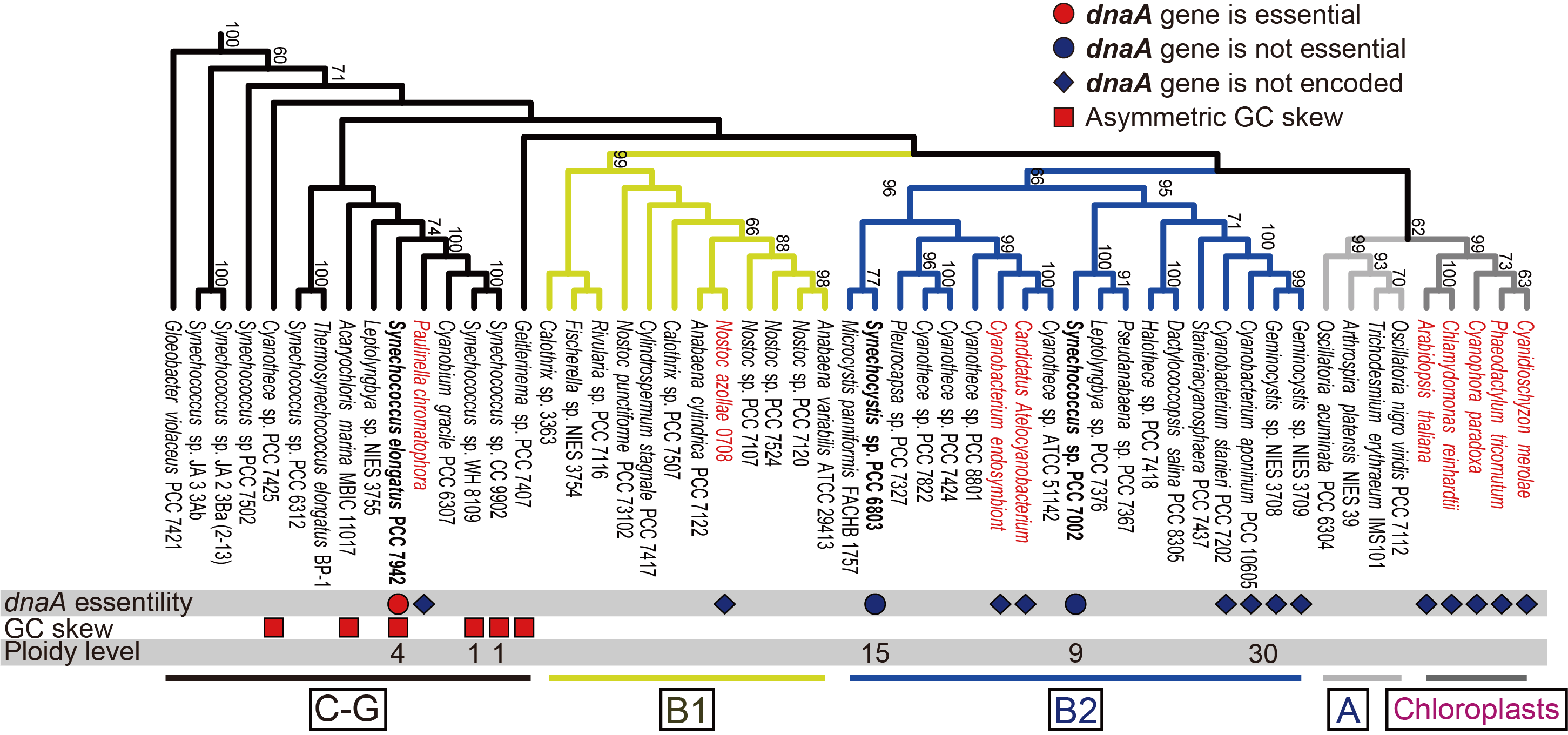 まず、我々はゲノムが完全解読されているシアノバクテリアにおいて、ゲノム構造やdnaA遺伝子の有無を系統的に解析した。その結果、非常に興味深いことにすでにdnaA遺伝子を失ったFree-livingのシアノバクテリアが存在していることが明らかとなった(図1; Cyanobacterium stanieri PCC 7202、Cyanobacterium sp. PCC 10605、Geminocystis sp. PCC 6308、Geminocystis NIES-3708と3709)。系統関係から考えると、共生しているシアノバクテリアや葉緑体とは独立してdnaA遺伝子を失ったことがわかる(図1)。これまでdnaA遺伝子を失ったFree-livingのバクテリアは報告がなく、共生以前にすでにdnaA遺伝子を失う方向に進化しうることがわかった。