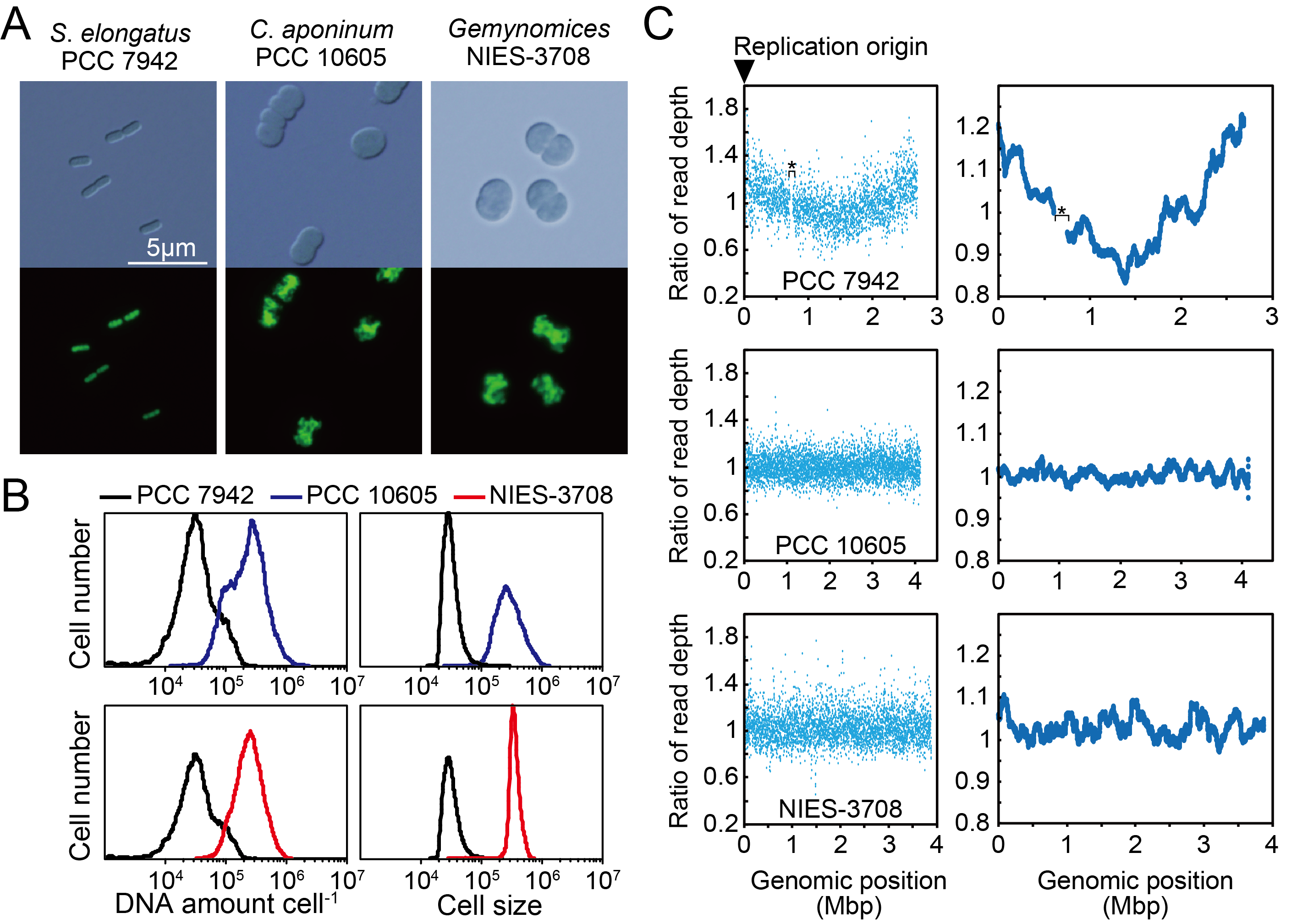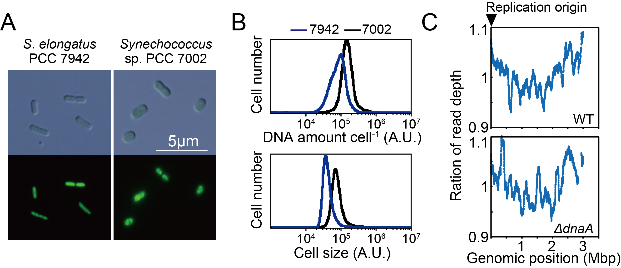 次にこれらdnaA遺伝子を失った2種のシアノバクテリアにおいて、形態的な観察を行ったところ、DnaA依存だとわかっているS. elongatusと比べ、細胞サイズが約8倍程度大きいことが顕微鏡観察やフローサイトメーターによる解析からわかってきた(図2A、B)。さらに、染色体のコピー数を調べた結果、細胞サイズと同様にS. elongatusに比べ8倍程度多いことがわかり、1細胞あたり平均で30コピー程度の染色体を保持している倍数体であることが明らかとなった(図2A、B)。