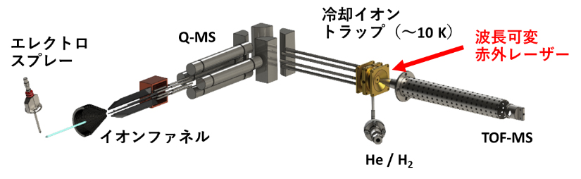 実験装置を図2に示す[2-3]。エレクトロスプレー法を用いてプロトン化したチロシンとb-MCDの錯体を気相中に取り出し,四重極質量分析器を用いて特定の質量のものを選別し,冷却イオントラップ(~10 K)に捕捉した。ここに水素ガスを導入し,錯体イオンに水素分子を付着させた。そこへ波長可変赤外レーザーを照射すると,赤外吸収に伴い水素分子が解離する。この解離で生じたフラグメントイオン(錯体イオン)を飛行時間型質量分析器により検出した。フラグメントイオン量をモニターしながら赤外光の波長を掃引することで赤外吸収スペクトルに相当する赤外光解離(IRPD)スペクトルを測定した。