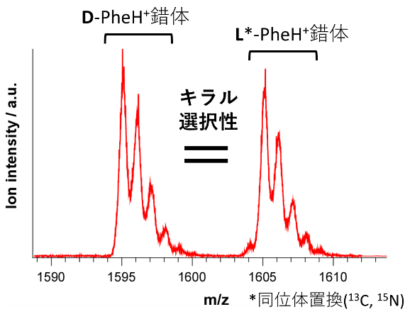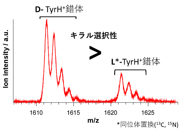 まずはL体とD体のチロシンのどちらに対してβ-MCDは選択性が高いかを調べるために,L-チロシンとD-チロシンを同量含む溶液にβ-MCDを加えたものをエレクトロスプレーし,質量スペクトルを測定した。プロトン化チロシンとβ-MCDの錯体の質量スペクトルを図3に示す。L-チロシンは同位体置換(13C, 15N)しているため,D体よりも分子量が10大きくなり,チロシンの両錯体を区別することが出来る。D-TyrH+錯体はL-TyrH+錯体の3倍ほど錯形成していることから,β-MCDはD-TyrH+に対して高いキラル選択性をもつことが分かった。