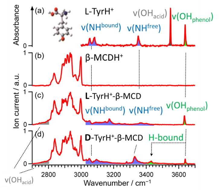 そこで本研究では,極低温イオントラップ赤外分光法を用いて,プロトン化チロシンの2つの光学異性体とb-CDの全てのOH基をメトキシ化したメチルb-CD(b-MCD)の錯体間の相互作用を調べ,そのホスト-ゲスト間の相互作用の違いからCDのキラル識別のメカニズムの解明を試みた。b-MCDを用いることで,CDに由来する複雑なOH伸縮振動バンドを除去し,プロトン化チロシン由来の振動バンドを明瞭に観測することが出来る。