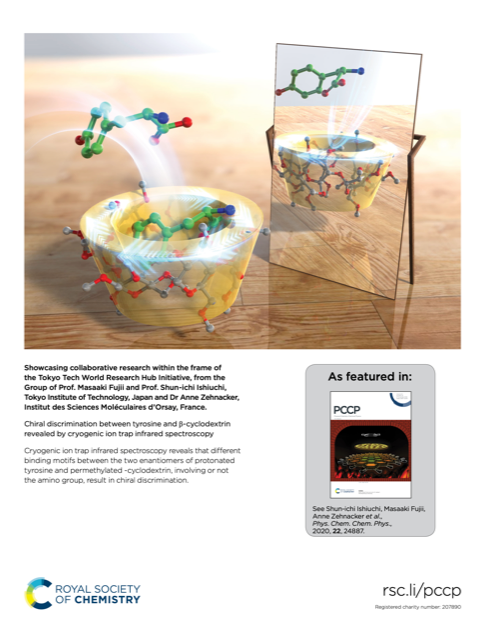 昨年度より本学理学院化学系・石内教授と共同で研究を進めている。今回の研究紹介では石内研究室の助教・平田圭祐先生ならびにParis-Saclay大教授(CNRS DR1)・本学WRHI特任教授であるAnne Zehnacker―Rentien先生との共同研究を紹介する。この研究は英国王立科学協会誌Phys. Chem. Chem. Phys.誌で表紙を飾り、また、Hot Articleに選ばれているものである。