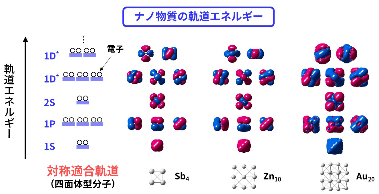 | 図1 | 四面体型ナノ物質(Sb4、Zn10、Au20)の軌道。ナノ物質が持つ原子の数や元素の種類が異なっても、対称性が同じであれば、軌道のエネルギーの順番や軌道の形が皆同じになることがわかります[4]。 |
