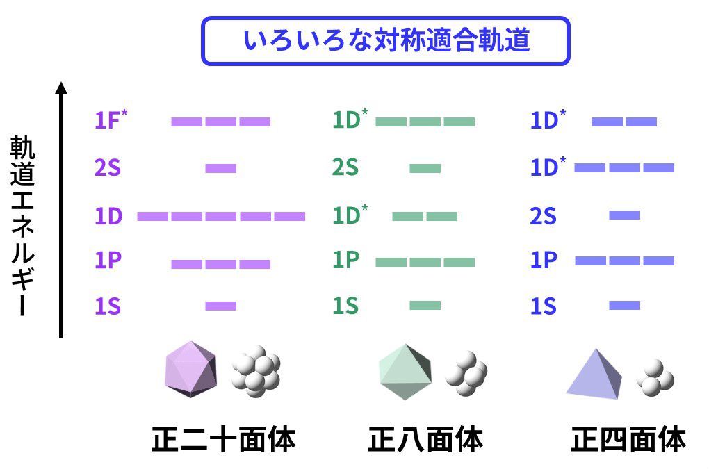 | 図2 | 様々な対称性を持つナノ物質の軌道。対称性によって、軌道のエネルギーの順番がそれぞれ異なることがわかる[4]。 |