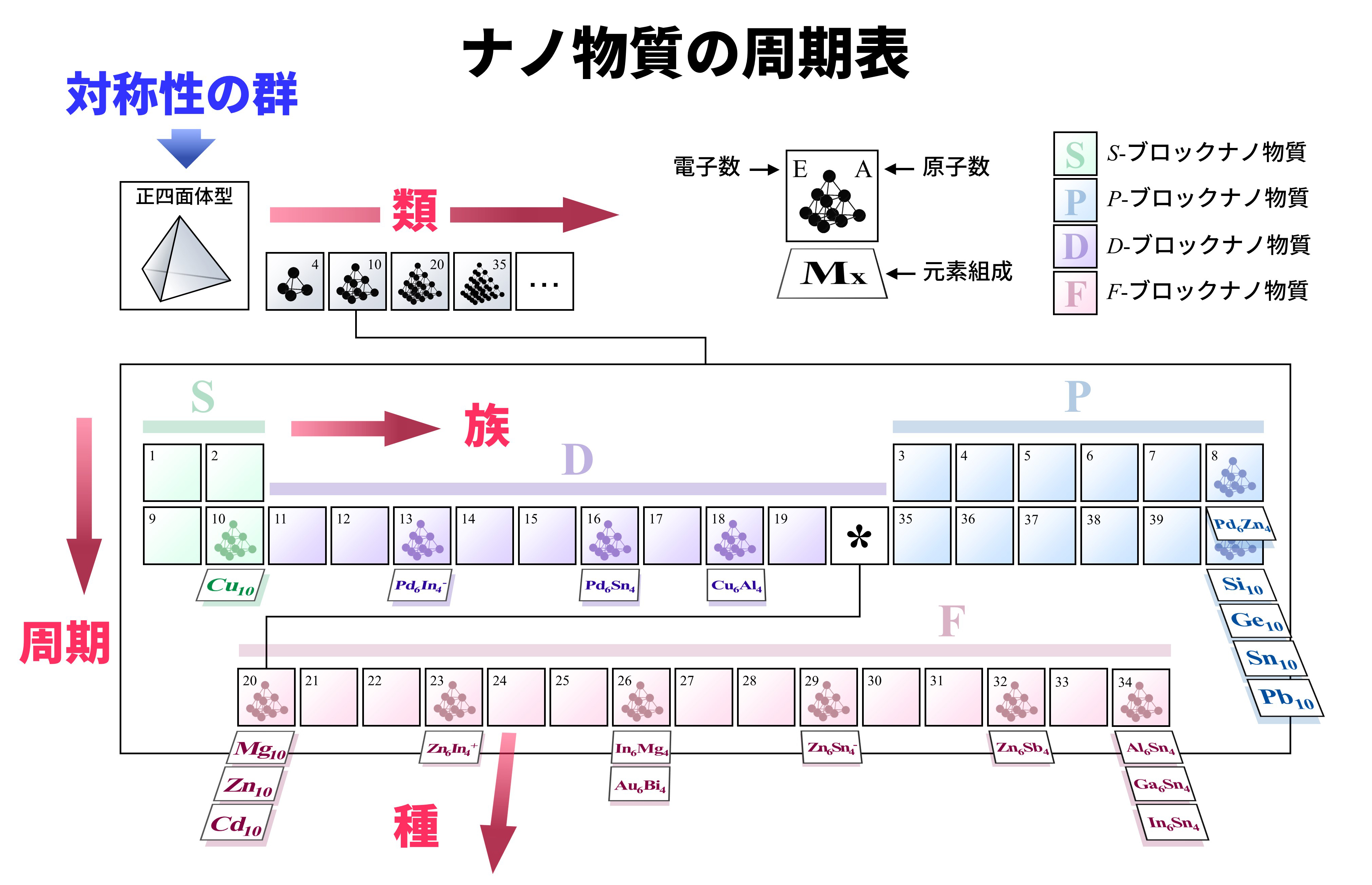 | 図3 | 四面体型ナノ物質の周期表の一例。「族」「周期」「類」「種」の四つの次元を持つこのような高次の周期表が、異なる対称性ごとに存在しています。これまで発見・合成されてきた様々なナノ物質を、本理論モデルによって一つの表の中に統合することができます[4]。 |