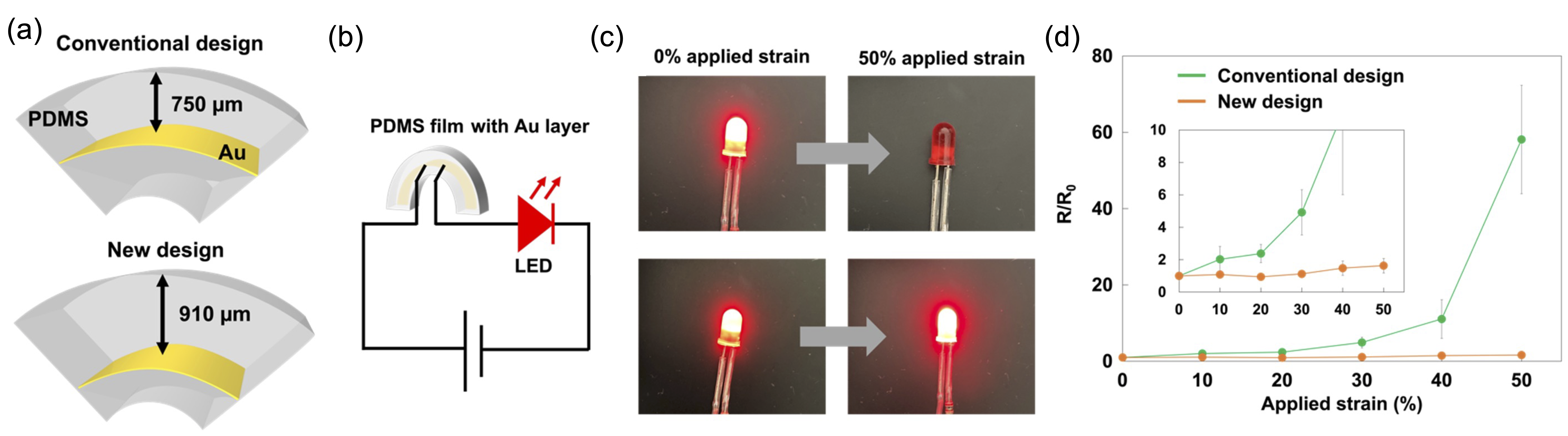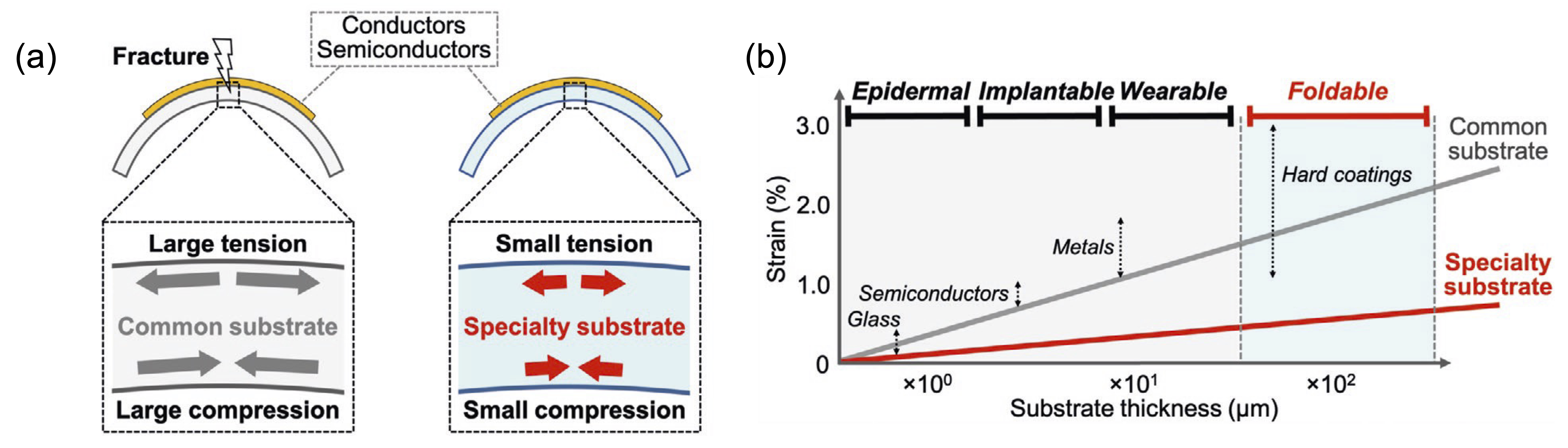フレキシブル電子デバイスは、フレキシブルエレクトロニクスやソフトロボティクスなどにおける新たなデバイス形態として注目されています。デバイスは、フレキシブルフィルム上に導電材料を構築することで作製されており、柔軟に変形する際に各構成材料が破壊しないことが求められます。デバイスが曲がるとフィルム表面は大きくひずみます(フィルムの外側は膨張し、内側は収縮する)。この表面ひずみが導電材料のひずみ限界を超えると、フレキシブルデバイスは壊れてしまいます(図1a左)。金属は1~3%のひずみで、半導体は1~2%のひずみで破壊することが知られています(図1b)。