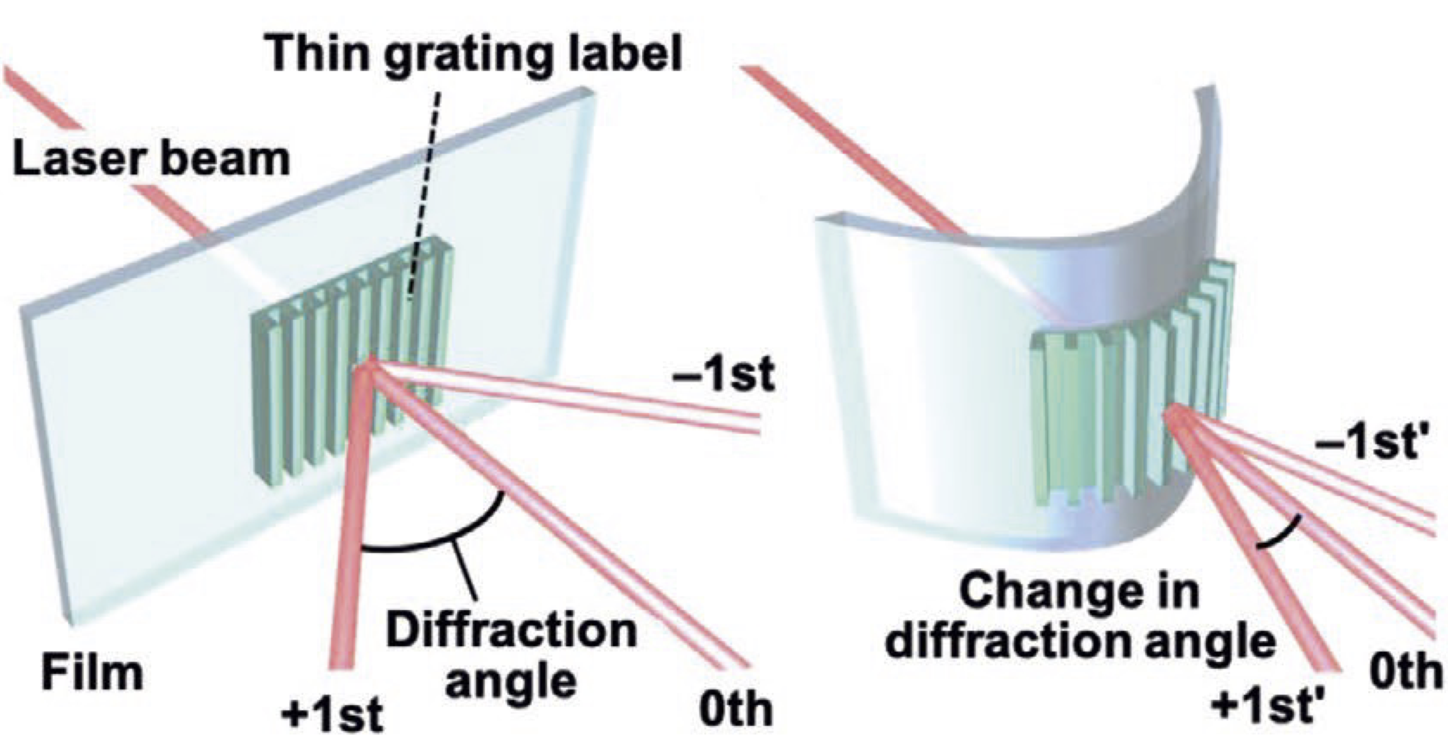 今回われわれは、大きく曲がるフィルムの表面ひずみを簡便に定量計測できる手法「表面ラベルグレーティング法」の開発に成功しました(図2)[1-4]。回折格子と呼ばれる数マイクロメートル周期の凹凸を持つ極薄膜ラベルをフィルム表面に貼り付けます。このフィルムにレーザー光を入射すると、凹凸の周期に応じて光が回折します。フィルムを曲げながら、回折角を計測することによりフィルムの表面ひずみを高精度で計測でき、0.01%以下のひずみ(ナノメートル単位の動き)を定量化することに成功しました[1]。本計測法は、表面が滑らかであれば、原理的に対象物を問わない利点があります。プラスチックだけでなく、ガラスや金属等の異種物質を積み重ねた積層フィルムの表面ひずみの計測にも成功し、汎用性の高い手法であることを実証しています。
