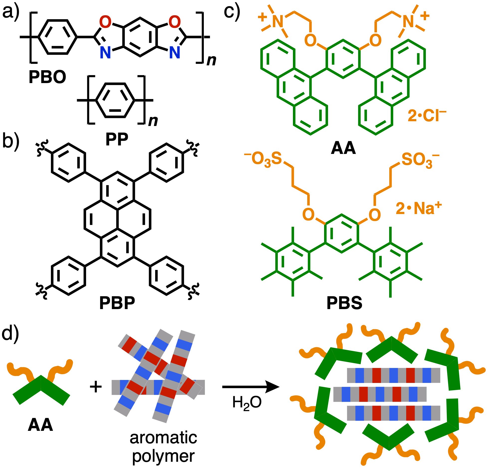 | 図1. | a)直鎖状とb)球状の未修飾芳香族ポリマーの構造。c) 湾曲型両親媒性分子AAおよびPBSの構造。d) 芳香環ミセル(AA)nによる内包を介したPBOの水溶化。 |