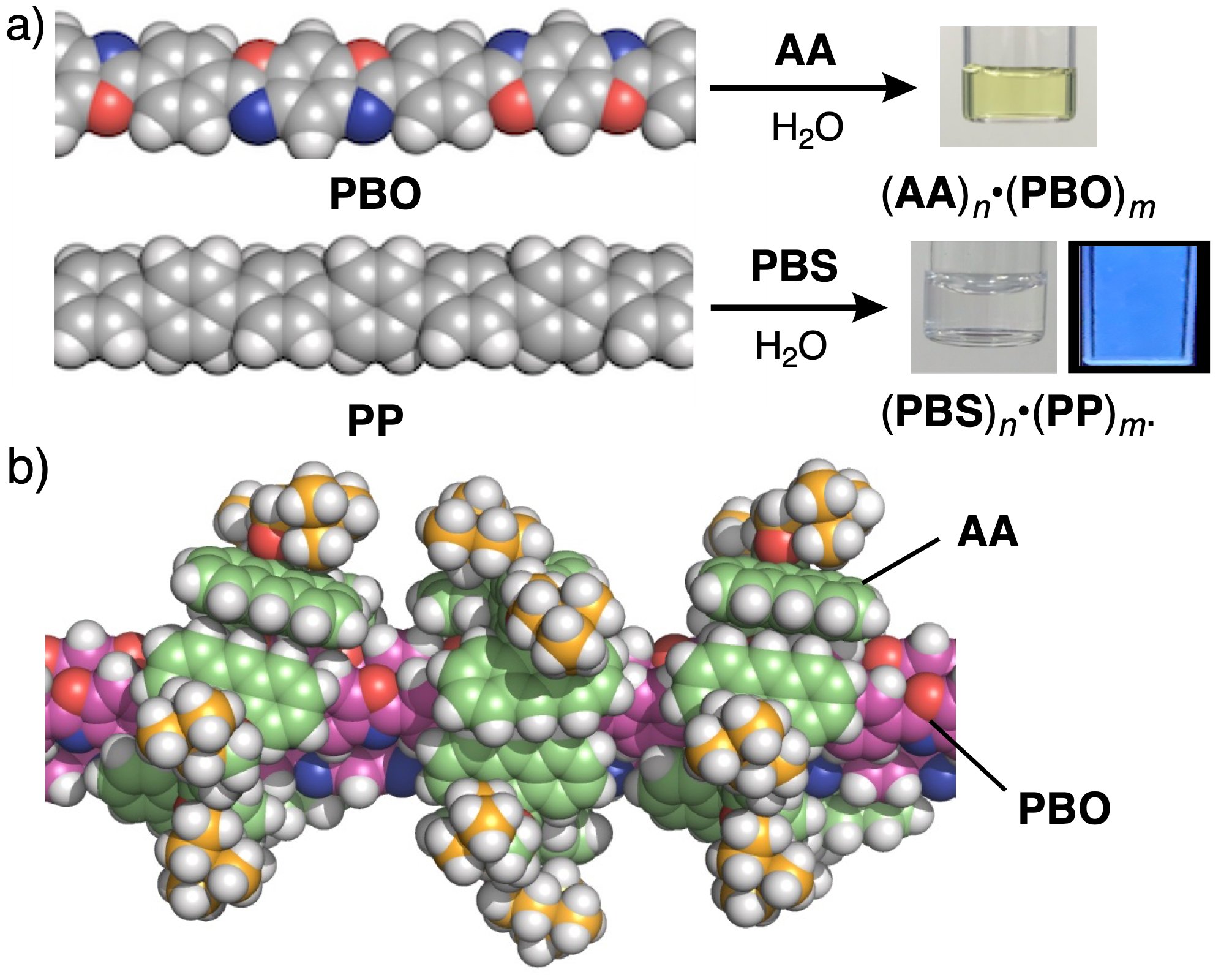 | 図2. | a) 湾曲型両親媒性分子AAおよびPBSによる、PBOおよびPPの内包を介した水溶化。b) 分子モデリングにより得られた内包体(AA)n•(PBO)mの最適化構造。 |