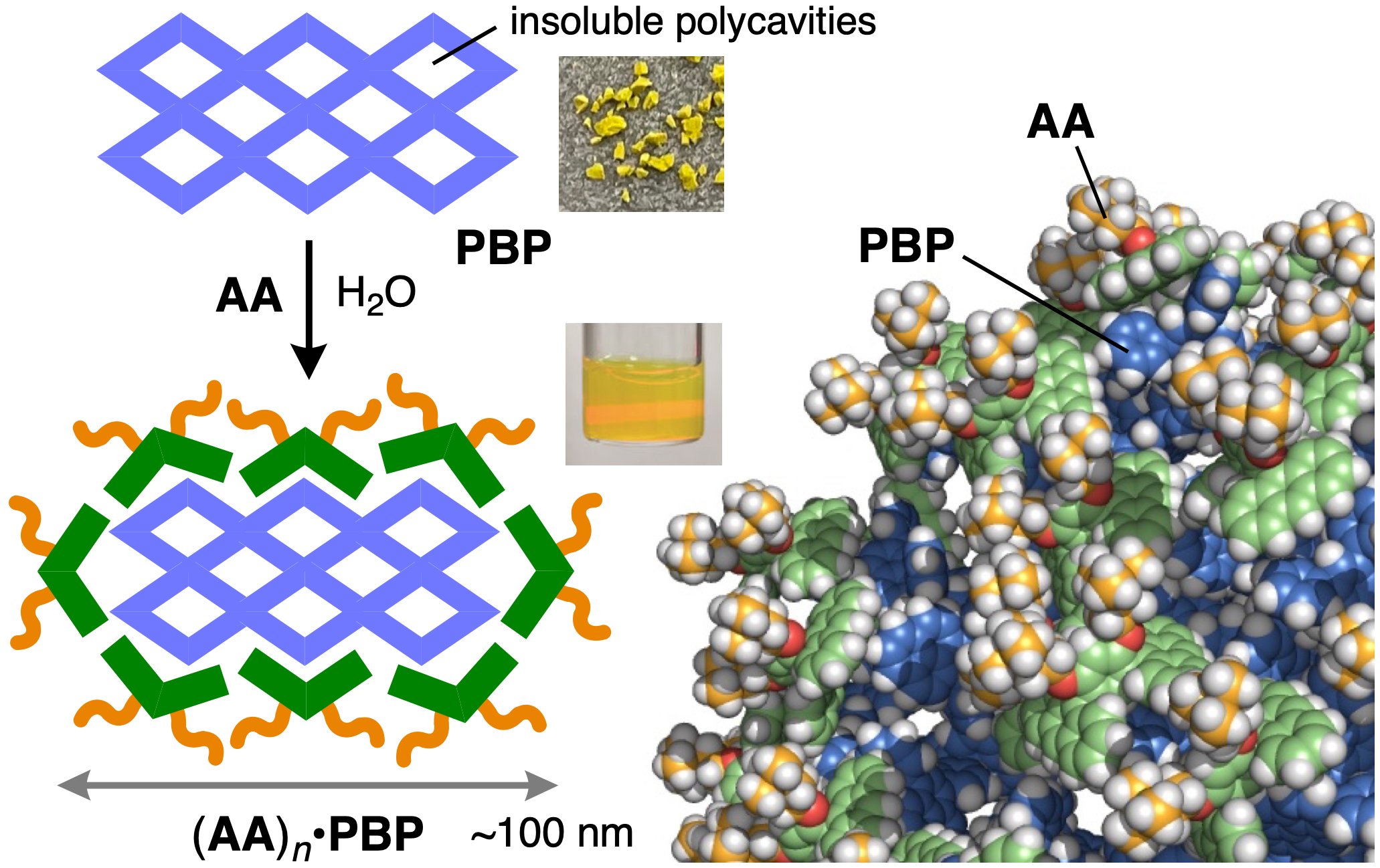 | 図4. | 湾曲型両親媒性分子AAによる多孔性の球状芳香族ポリマーPBPの内包による水溶化と、内包体(AA)n•PBPにおける部分的な分子モデリング。 |