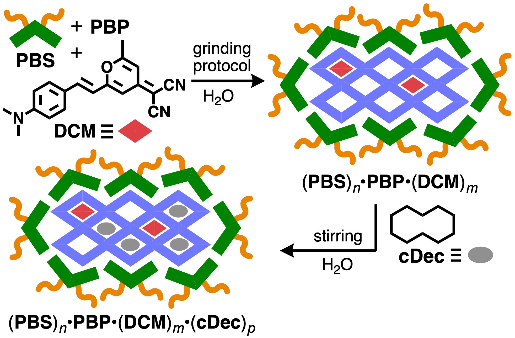 水溶化されたPBPは、さらに色素や炭化水素に対して多空間ホストとして機能した。両親媒性分子PBSを用いた簡便な3成分すり潰しにより、色素DCMをPBPの多空間内に取り込み、3成分複合体(PBS)n•PBP•(DCM)mの調製に成功した(図5)。DCMの取り込みは、その新たな吸収および蛍光バンドの出現によって確認された。さらに、この水溶液にシクロデカン(cDec)を添加・攪拌することで、4成分複合体(PBS)n•PBP•(DCM)m•(cDec)pが形成された(図5、右)。cDecの導入によってDCMが多空間内にさらに効率的に取り込まれたことで、DCMに由来する蛍光強度は約8倍に増加した。同様の操作により、不溶性のチオフェン系オリゴマーを用いた4成分複合体の構築にも成功した[4]。